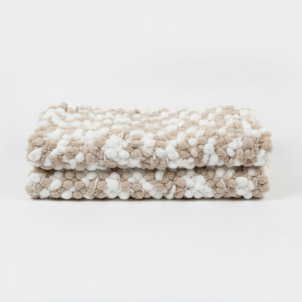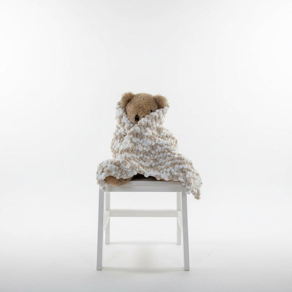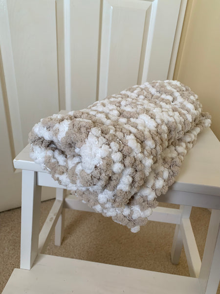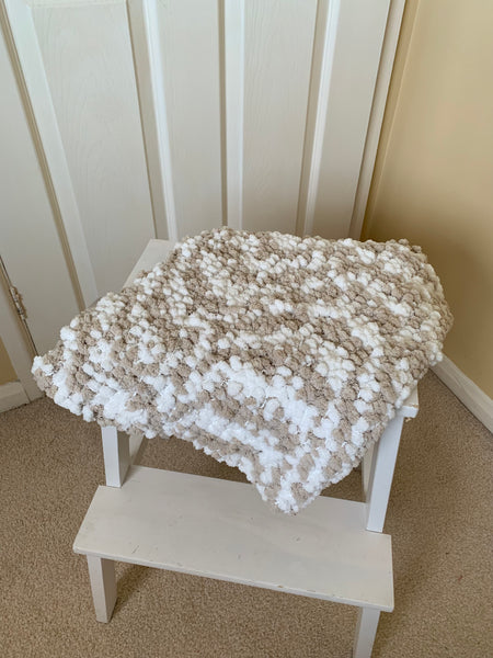 This gorgeous baby blanket is hand knitted using a delicate beige and white mini pom pom wool. This beautiful handmade blanket would make the perfect gift for any baby shower or new baby.
