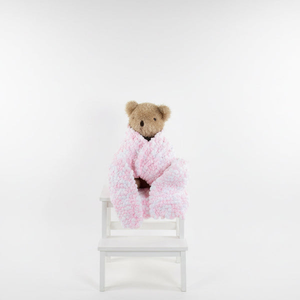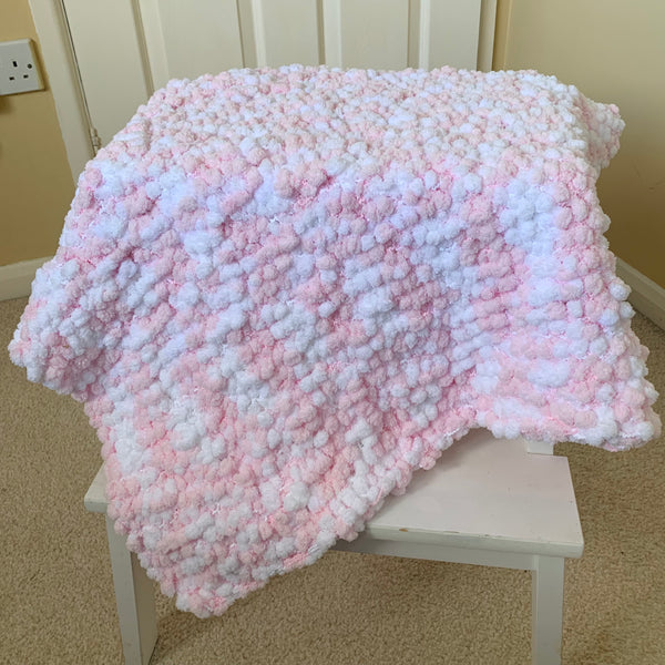 This gorgeous baby blanket is hand knitted using a delicate pink and white mini pom pom wool. This beautiful handmade blanket would make the perfect gift for any baby shower or new baby.