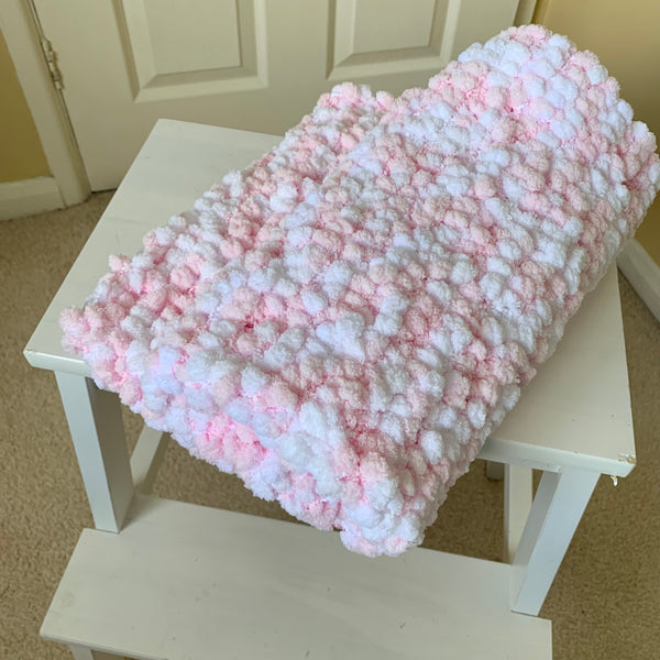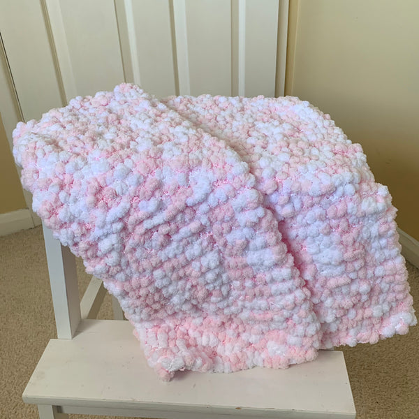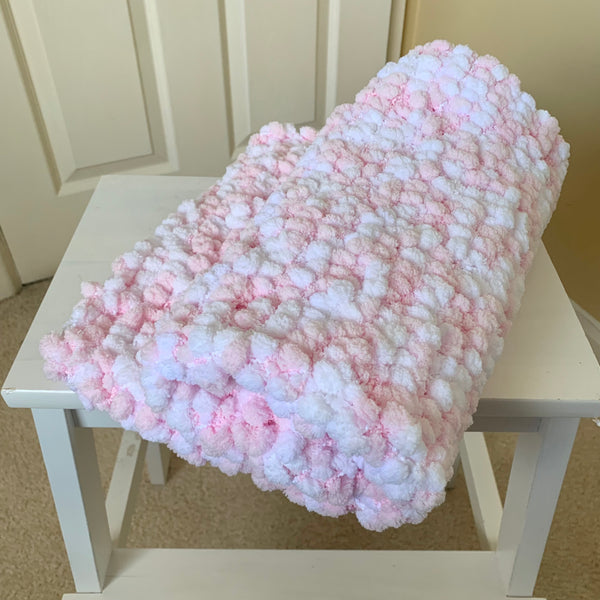 Hand Knitted Pink and White Baby Blanket, Mini Pom Pom Wool