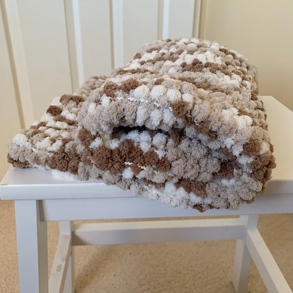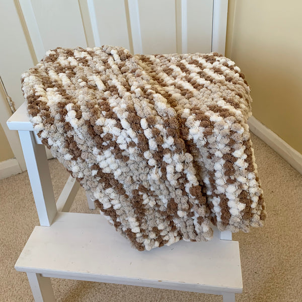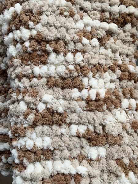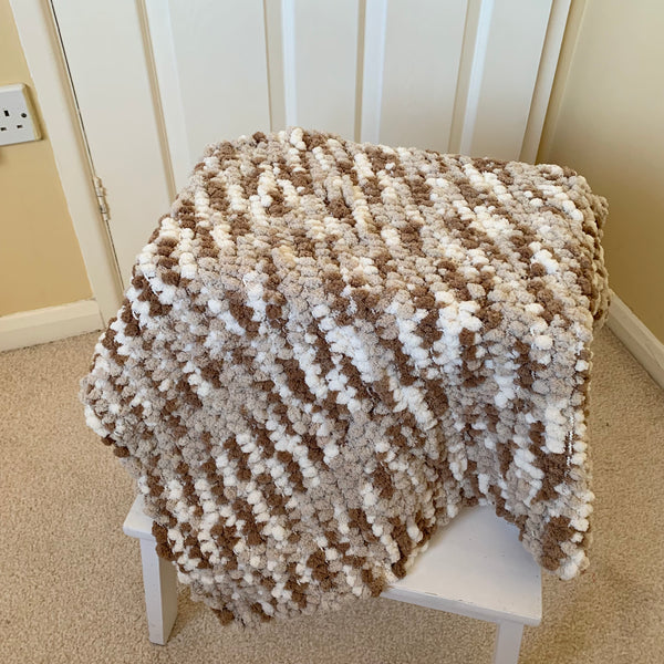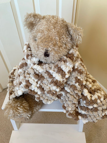 This gorgeous baby blanket is hand knitted using a delicate mini pom pom wool. This beautiful taupe handmade blanket would make the perfect gift for any baby shower or new baby.