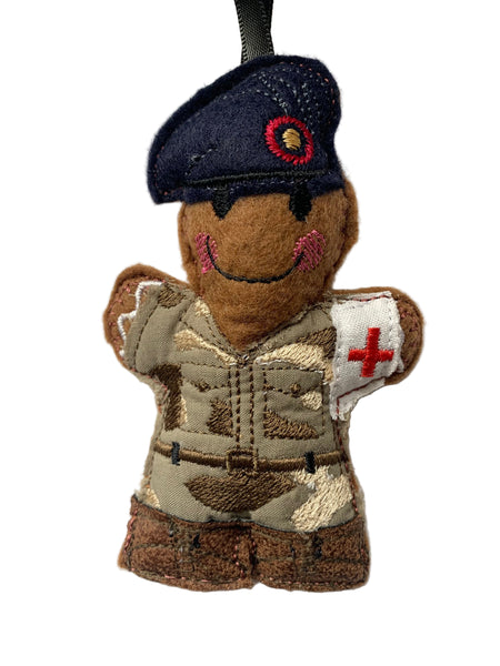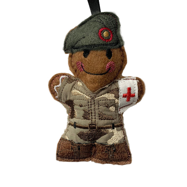 This beautifully detailed Army Medic Soldier Gingerbread man novelty character adds an unusual twist to the traditional gingerbread ornament!  This Military style decoration in cotton fabric camouflage uniform would make the perfect going away or Retirement gift. As a tree ornament it would be the perfect addition to any Christmas decoration collection.