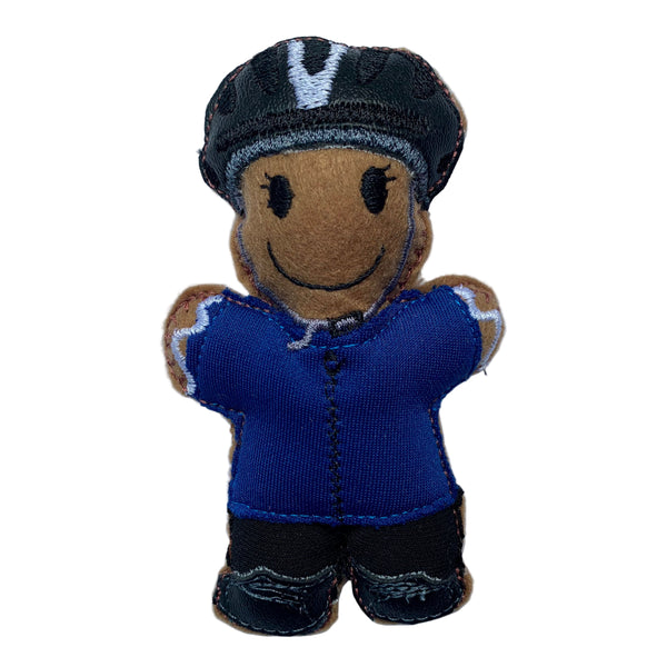 This beautifully detailed cyclist novelty character is dressed in real scuba fabric top and shorts with vinyl hat and shoes. Adds an unusual twist to the traditional gingerbread ornament!  This road racing decoration would make a welcome addition to your gingerbread decor, whether it be hanging on your Christmas Tree, bag or even a rear view mirror charm!